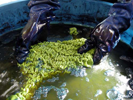 自主製品として長年、藍染を中心とした草木染めを行っており、常に一般市場でも通用する商品づくりを意識しながら創作に取り組んでおります。 |